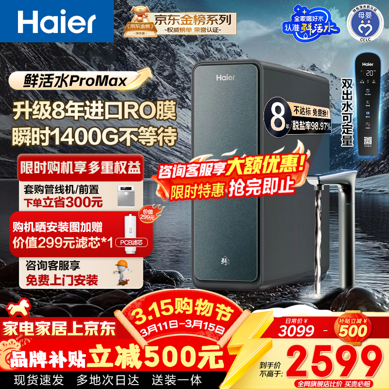 旗舰店海尔(Haier)净水器家用鲜活水ProMax 进口8年长效膜 瞬时1400G大通量厨房专用台下用冰直饮水机套装RO反渗透膜 【鲜活水ProMax】8年长效进口RO膜 瞬时1400G大通量