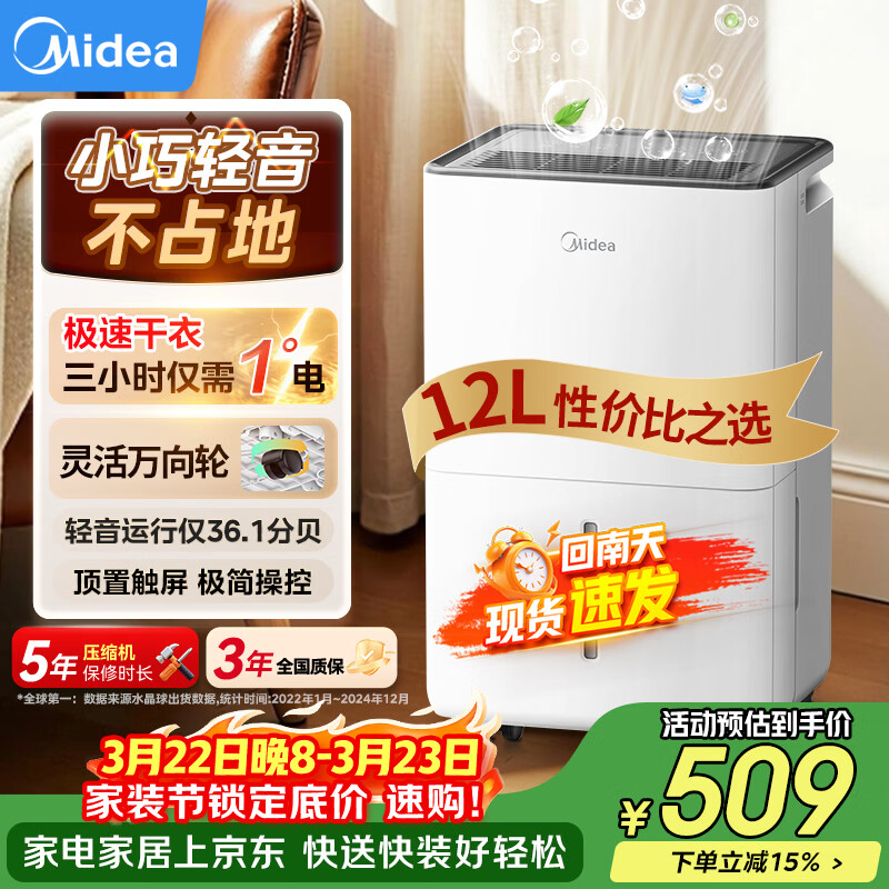自营美的(Midea)除湿机/抽湿机12升/天 自营家用20㎡轻音小型回南天客厅卧室内防潮专用干衣吸湿器CF12BD/N7-DO