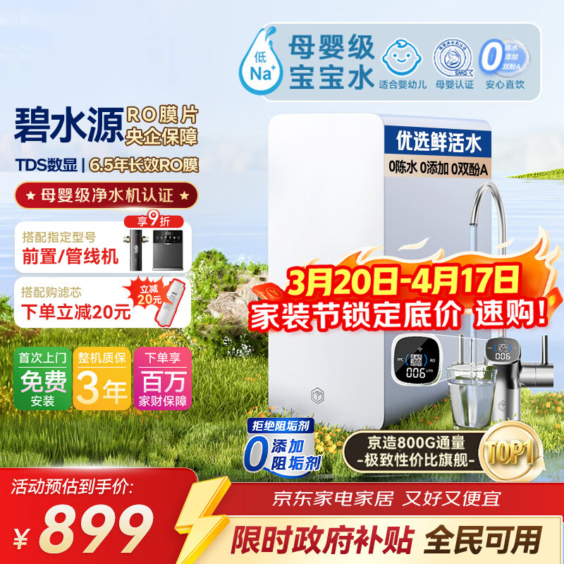 自营京东京造京东京造净水器家用净水机0阻垢剂灵犀800GPro2.0 低钠宝宝水 陶氏RO反渗透母婴厨下直饮机净饮机