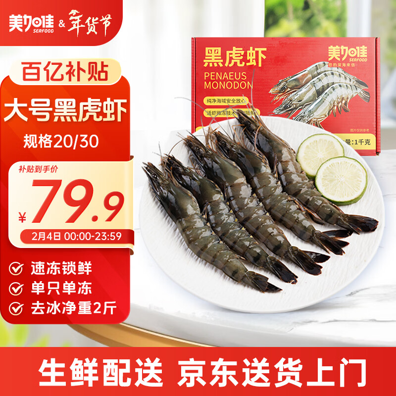 自营美加佳大号黑虎虾 去冰净重2斤 20-30只 烧烤大虾 生鲜虾类