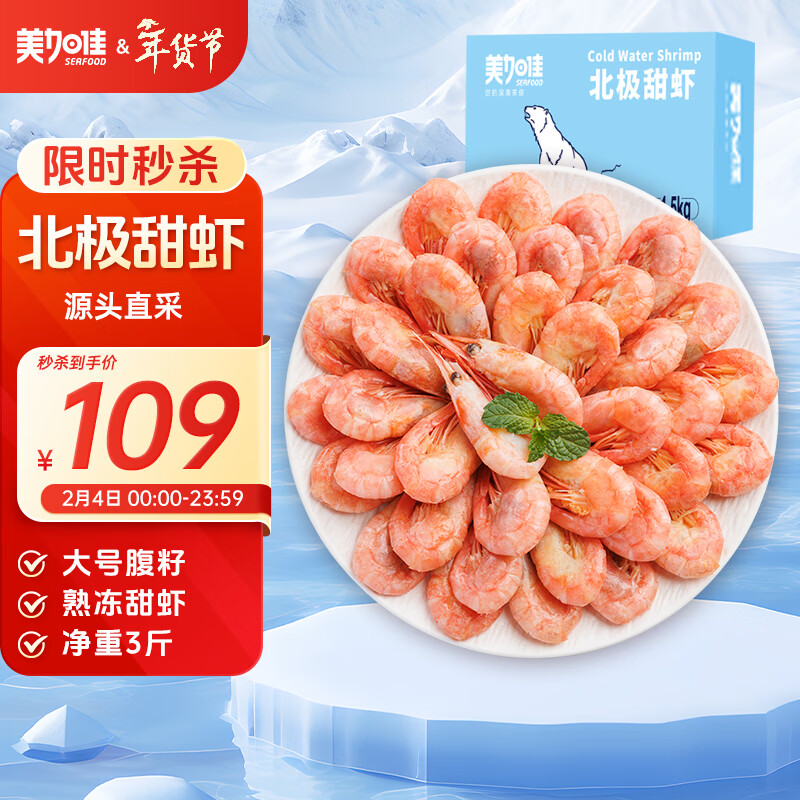 自营美加佳加拿大 大号熟冻北极甜虾腹籽净重3斤 规格80/100 海鲜水产