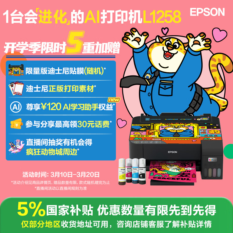 自营爱普生(EPSON)墨仓式L1258 A4彩色无线单功能家用打印机 AI学习打印机(微信/远程打印)