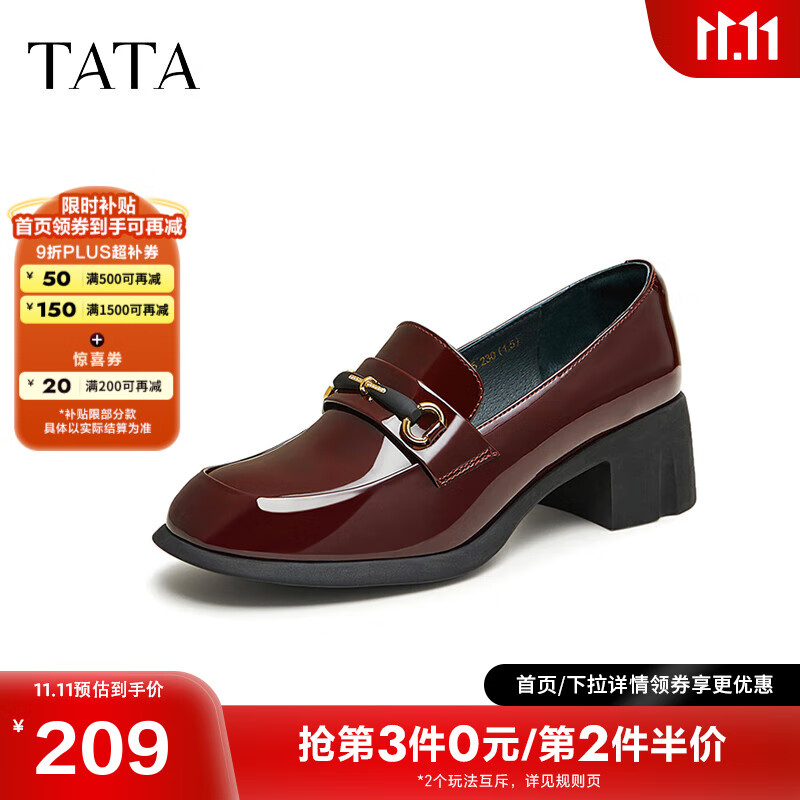 旗舰店他她(TATA)英伦粗跟乐福鞋女一脚蹬浅口单鞋小皮鞋秋新WCNA5CA4 酒红 36