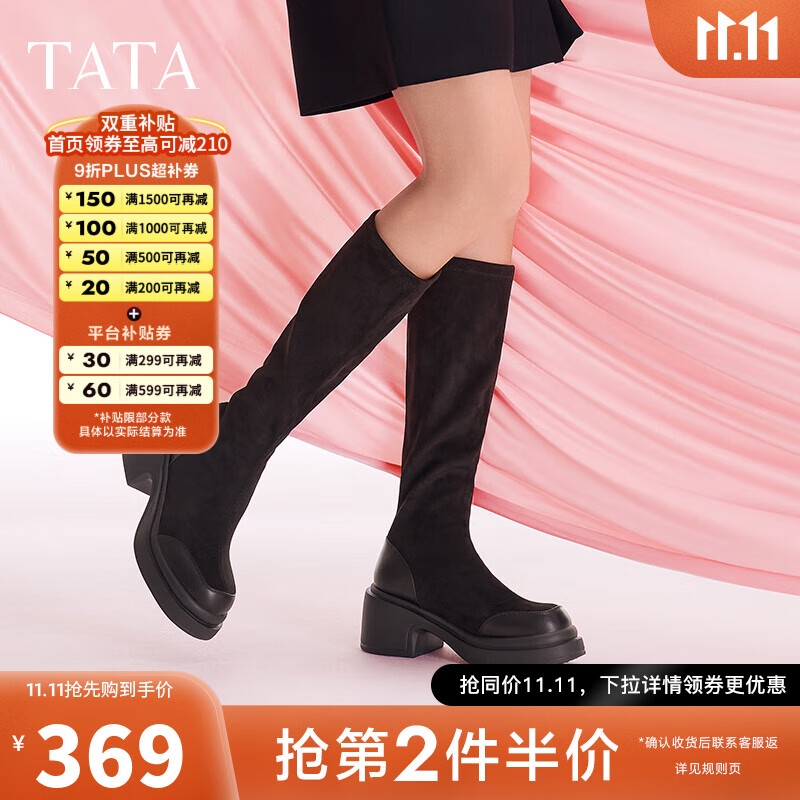 旗舰店他她(TATA)显瘦粗跟长筒靴女靴气质瘦瘦靴弹力靴冬新款WEC02DG4 黑色 34