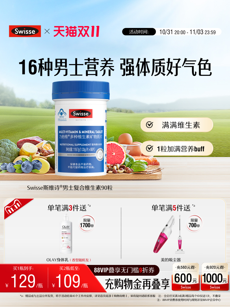 旗舰店Swisse斯维诗 多种维生素矿物质片 蓝帽认证「直播间专享」 【男士复合维生素】1.33g/片*90片*1瓶