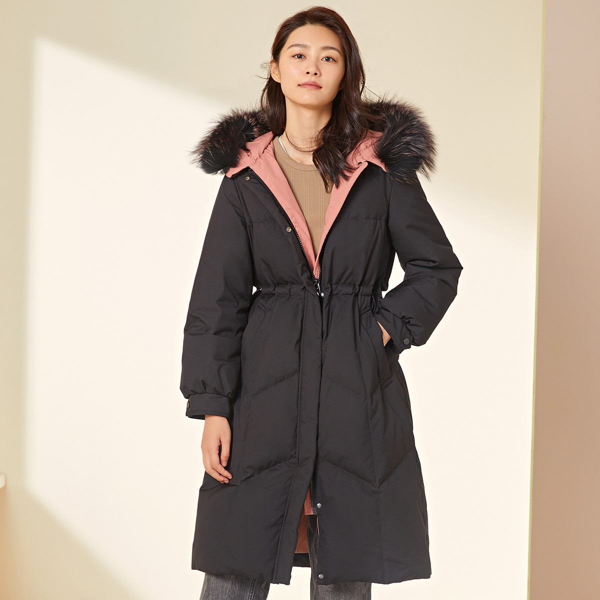 千仞岗 女款秋冬鸭绒收腰中长款大毛领袖保暖羽绒服外套
