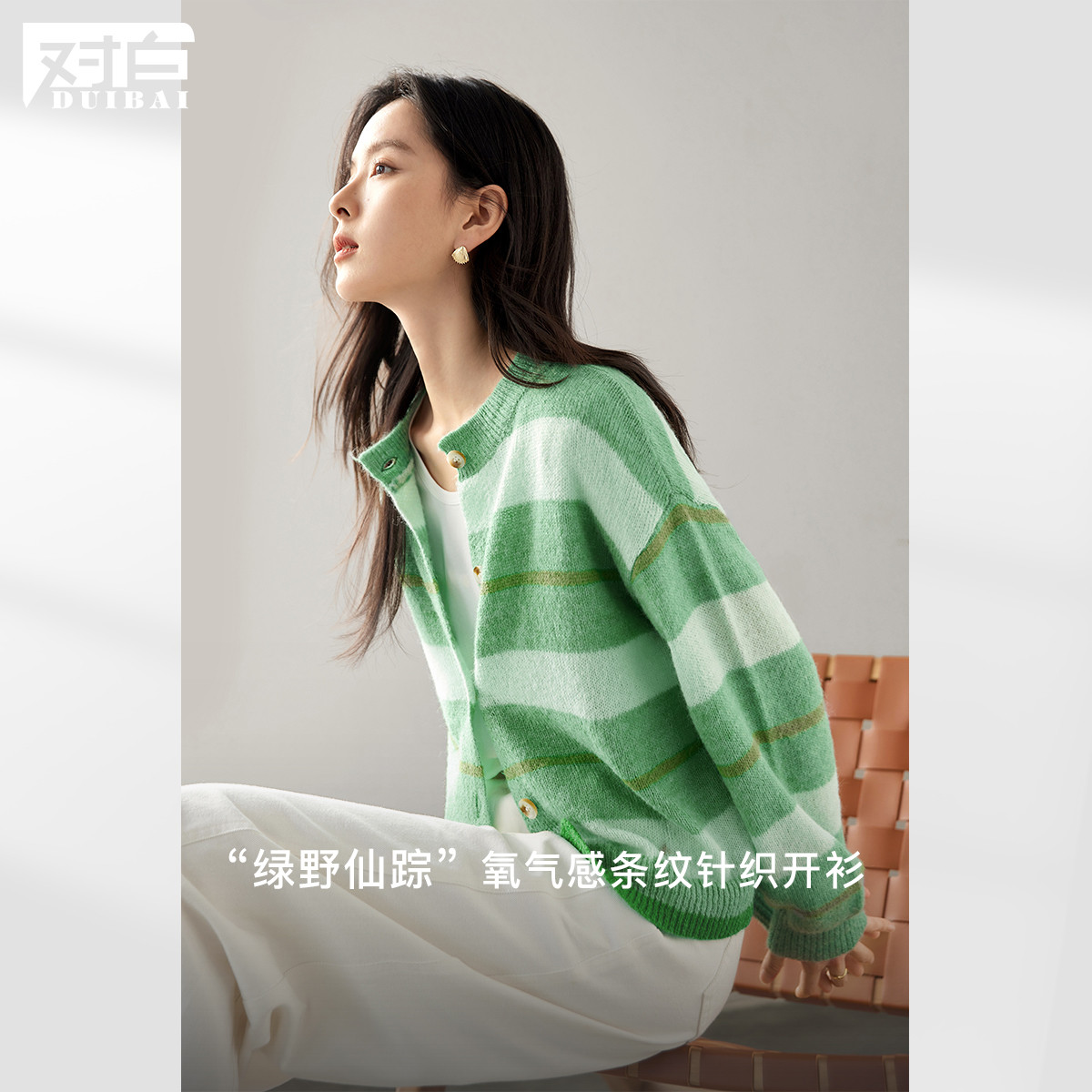 对白 【绿野仙踪】2025春秋氧气感条纹针织开衫软糯外套女式毛衣