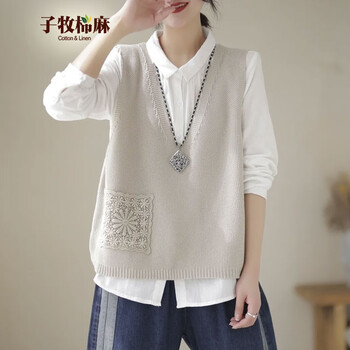 旗舰店子牧棉麻2023秋装 女韩版背心外穿V领针织镂空马甲宽松纯色坎夹上衣2312 米白色 均码(建议90-145斤)