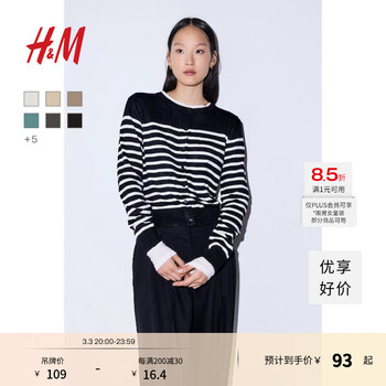旗舰店H&M女装2024秋季新款针织衫舒适慵懒舒适空调衫短款开衫0579541 黑色/白色条纹 M 165/96