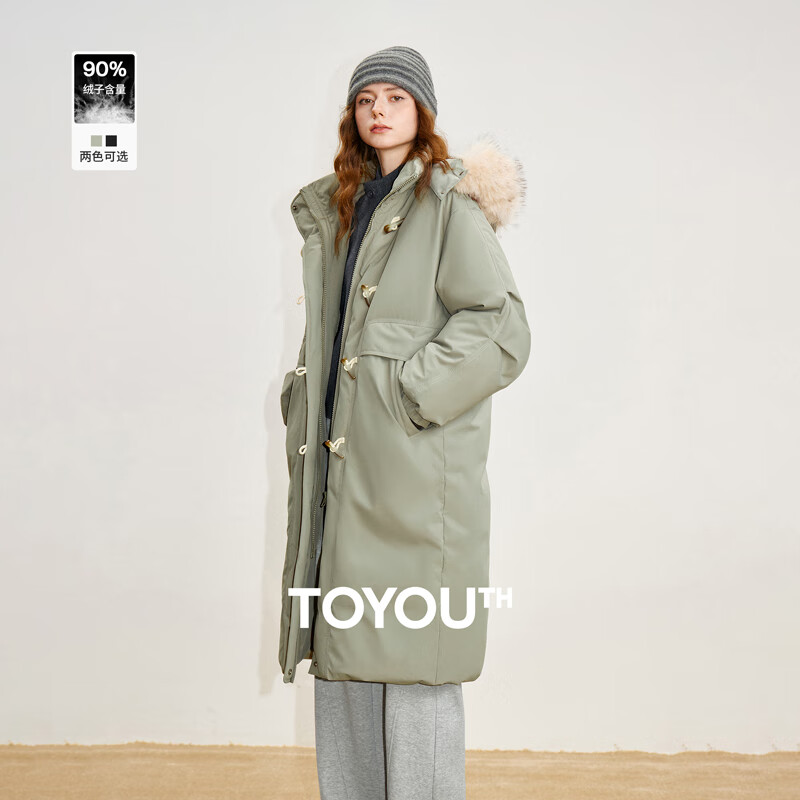 旗舰店初语羽绒服女2025冬季新款牛角扣宽松毛领连帽90绒三防黑科技外套 浅灰绿 M