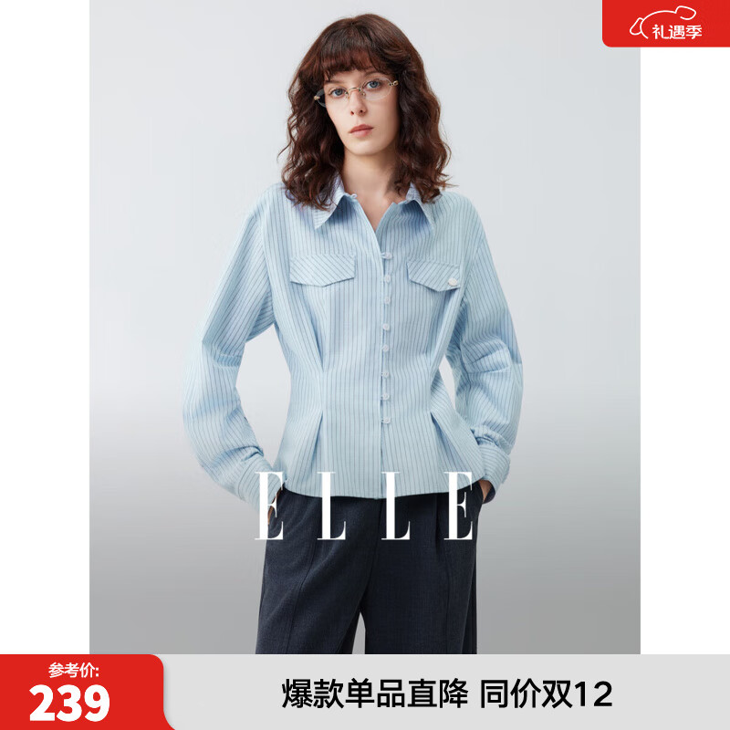 旗舰店ELLE法式条纹松弛感收腰衬衫女2025秋季新款宽松高级感通勤衬衣 蓝色 M