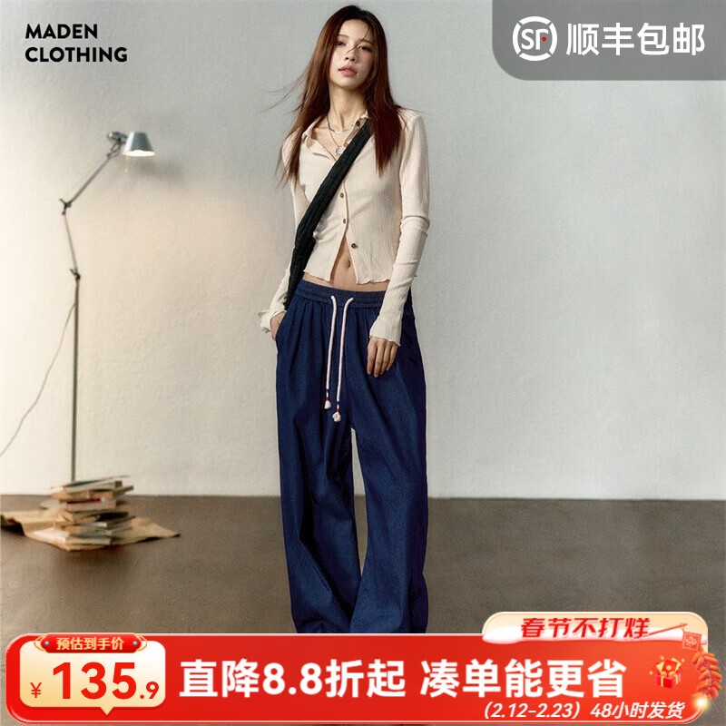 旗舰店马登女装 冰丝牛仔裤小个子松紧腰抽绳凉感直筒裤气质显瘦长裤子...