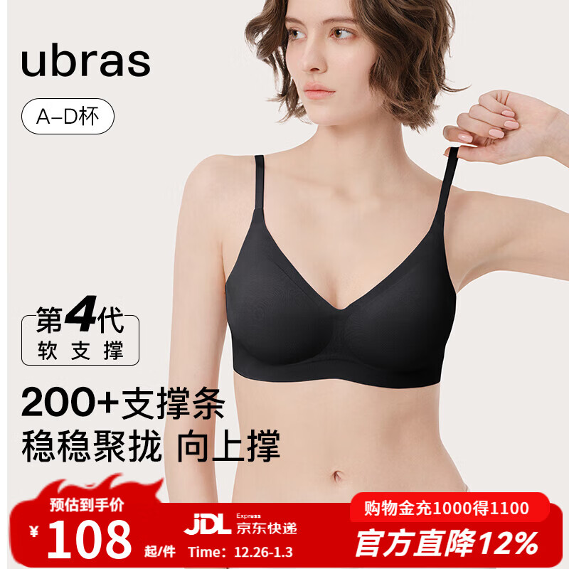 旗舰店ubras[虞书欣同款]夹心软支撑光面小胸聚拢女无痕内衣隐形无钢圈文胸罩 【背勾款】黑色 M 75A/75B