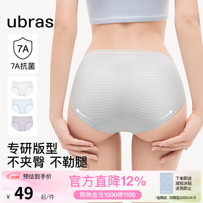 旗舰店ubras【纯棉抗菌裆】亲肤透气女士内裤中腰三角裤7A抗菌(三条装) 涟漪蓝色+柔灰紫色+白色 3条 M