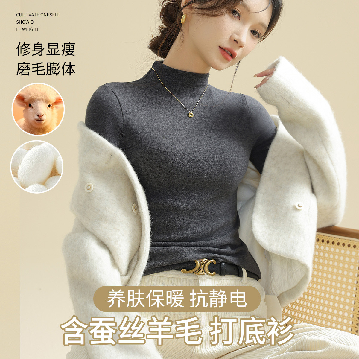 【含羊毛蚕丝】高级感洋气半高领打底衫秋衣可外穿女士保暖上衣