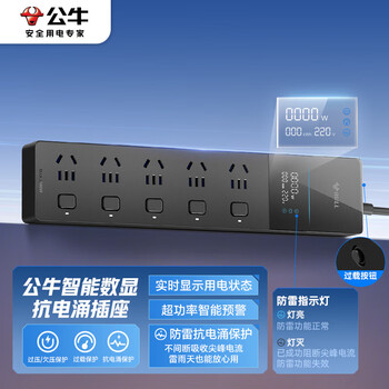 自营公牛(BULL)智能数显抗电涌防雷过载保护插座/插线板/插排/排插/接线板 5位分控开关全长1.8米 GNV-UK105F