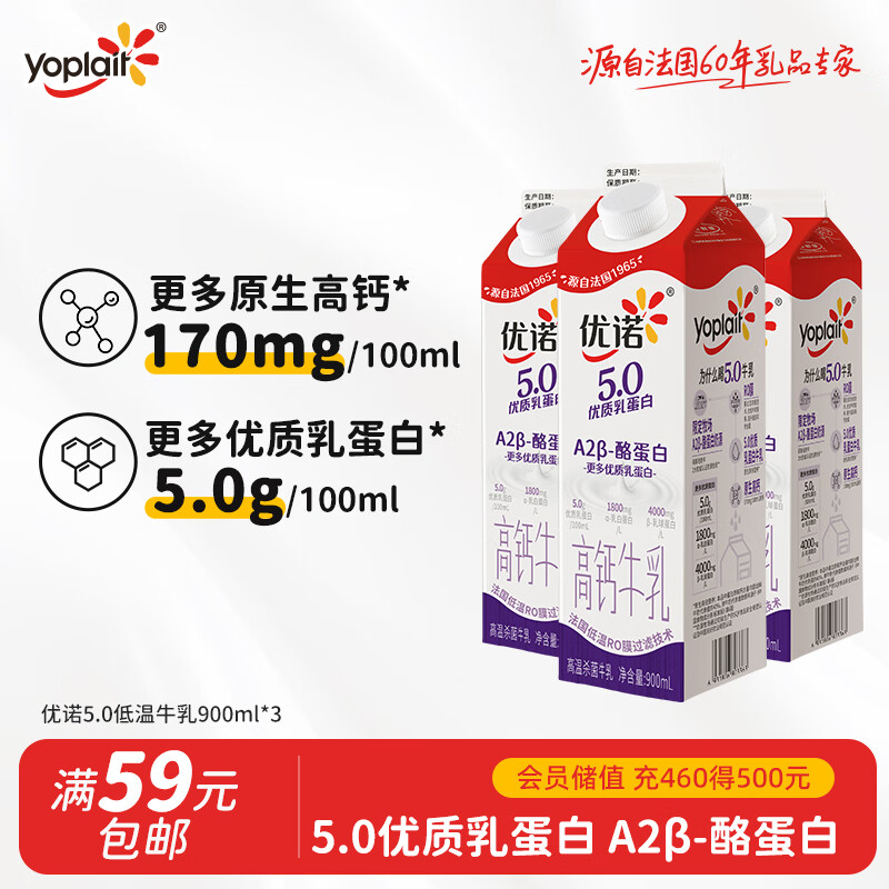 自营5.0 A2型β-酪蛋白 牛乳 900ml*3盒 优质乳蛋白低温牛奶