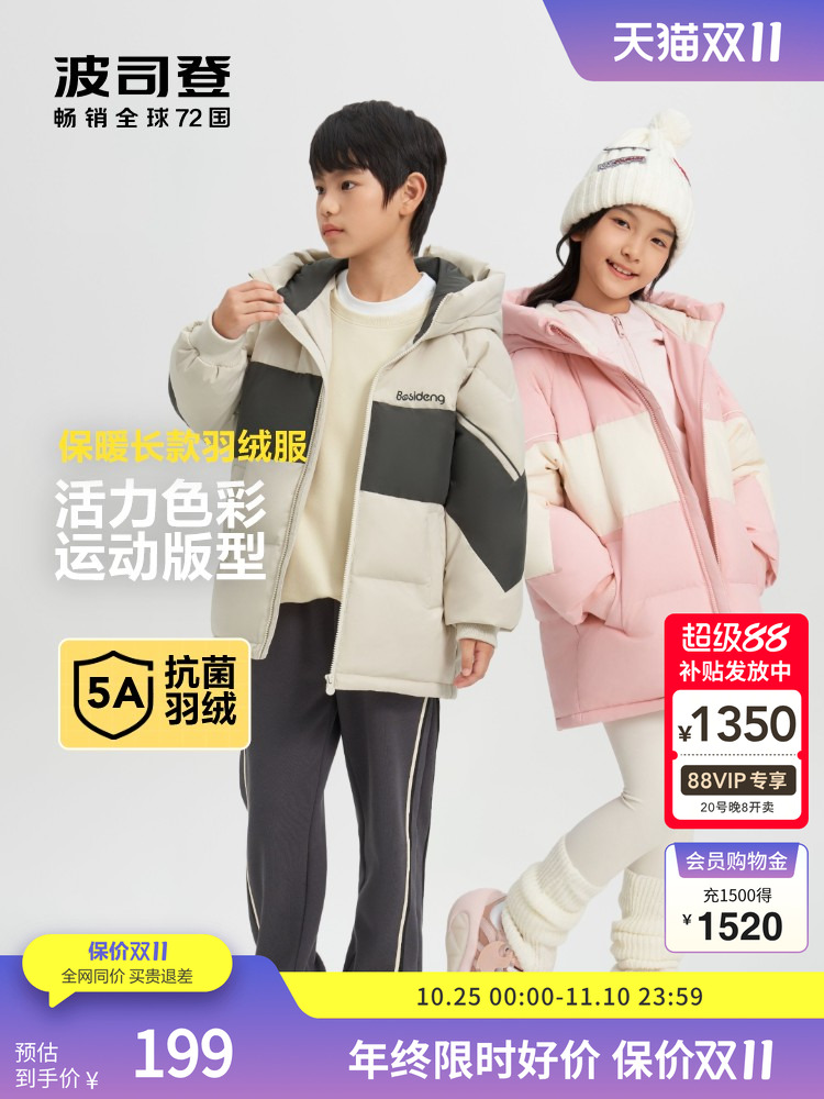 旗舰店波司登奥莱冬季儿童拼色时尚童趣保暖连帽短款连帽厚羽绒服