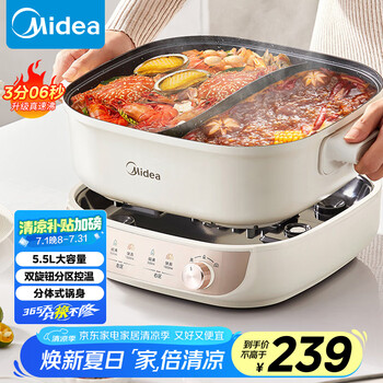 自营美的(Midea)火锅专用锅 电火锅鸳鸯锅电煮锅 3分06秒速沸5.5L 分体多功能锅火锅锅多用途锅HGS282813