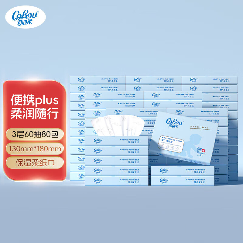 旗舰店可心柔V9婴儿保湿纸巾柔纸巾新生宝宝手口鼻敏感肌适用超柔乳霜面巾纸 3层 60抽*80包
