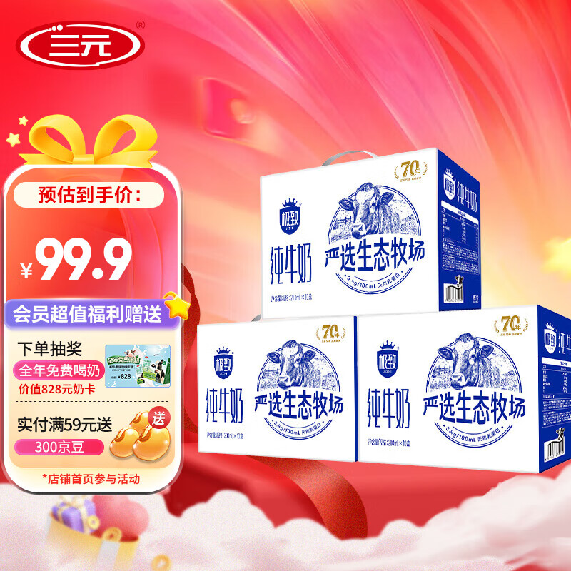 旗舰店三元(SAN YUAN)极致全脂纯牛奶严选生态牧场3.4g乳蛋白 送礼团购 严选200ml*10盒*3提装