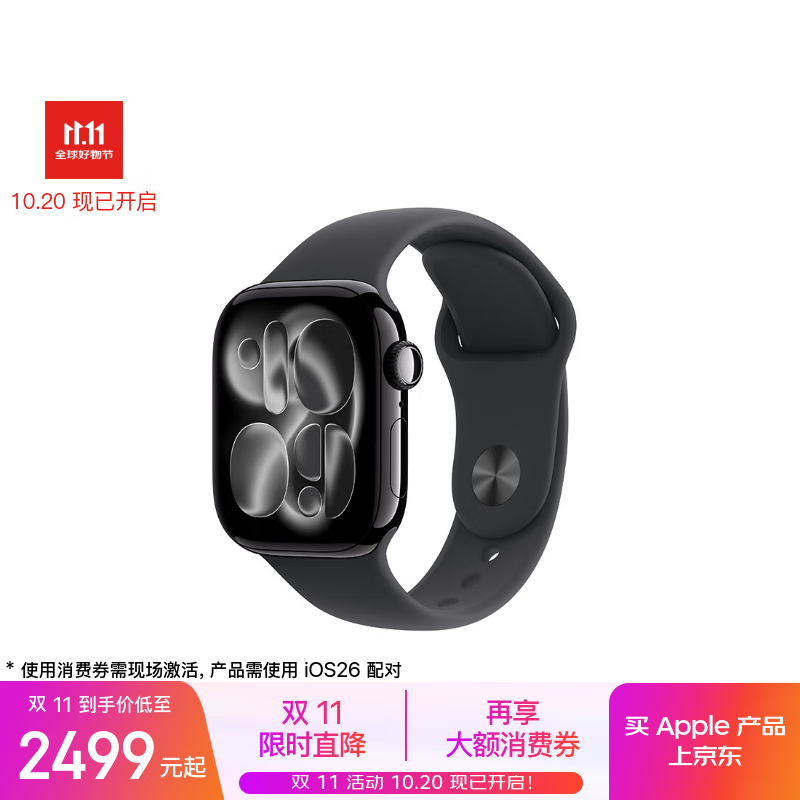 自营Apple/苹果 Watch S11 智能手表46毫米深空灰色铝金属表壳黑色运动型表带S/M 【GPS款】