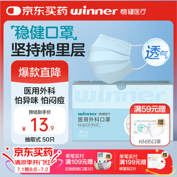 自营稳健一次性医用外科口罩50只/盒 棉里层亲肤透气防过敏防尘夏季防晒