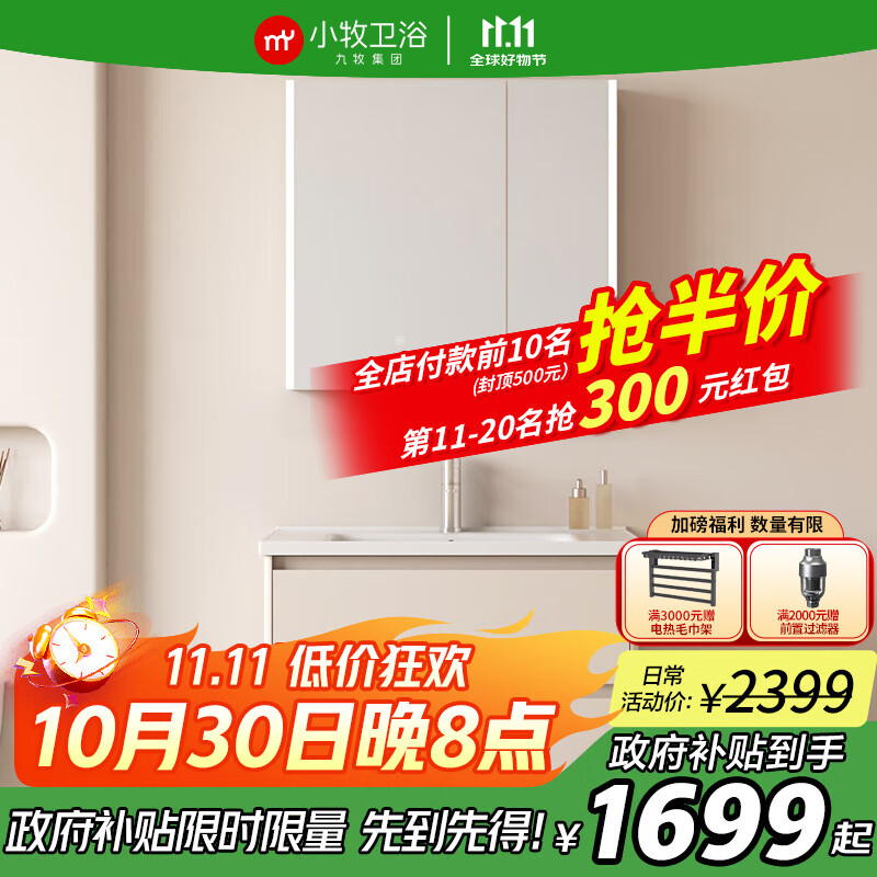 旗舰店九牧(JOMOO)浴室柜小牧卫浴卫生间洗手脸盆柜组合陶瓷洗漱台镜柜MAB3000 隐藏抽纸口+美妆架+双侧镜灯80cm