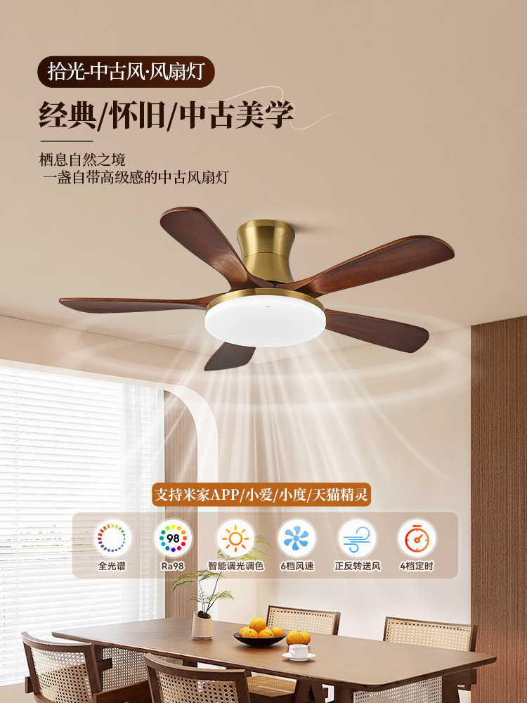 旗舰店雷士照明实木扇叶餐厅吊扇风扇灯客厅卧室吸顶灯中古中式电风扇灯