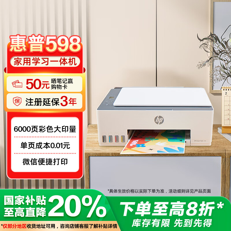 自营惠普(HP)598 家用学习连供无线打印一体机 大容量可加墨多功能打印复印扫描 彩色家庭打印机