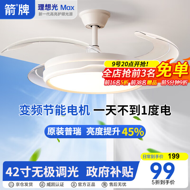 自营ARROW箭牌 高显指护眼风扇灯吊扇灯卧室隐形电扇灯灯具
