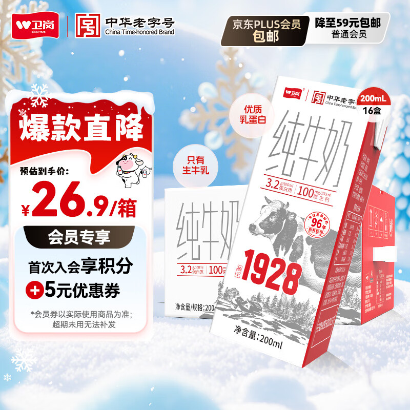 自营卫岗1928全脂纯牛奶200ml*16盒装 整箱早餐纯奶/中华老字号