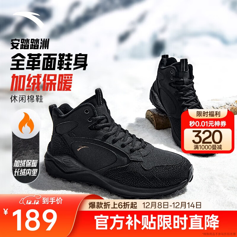 自营安踏踏洲大棉鞋休闲鞋男鞋冬季革面加绒加厚保暖厚底增高耐磨运动鞋子